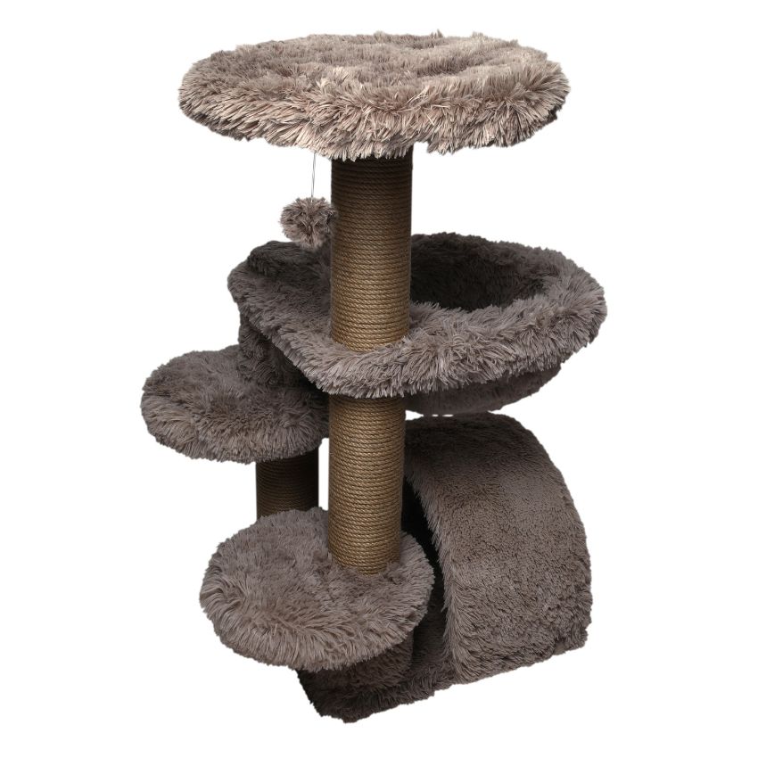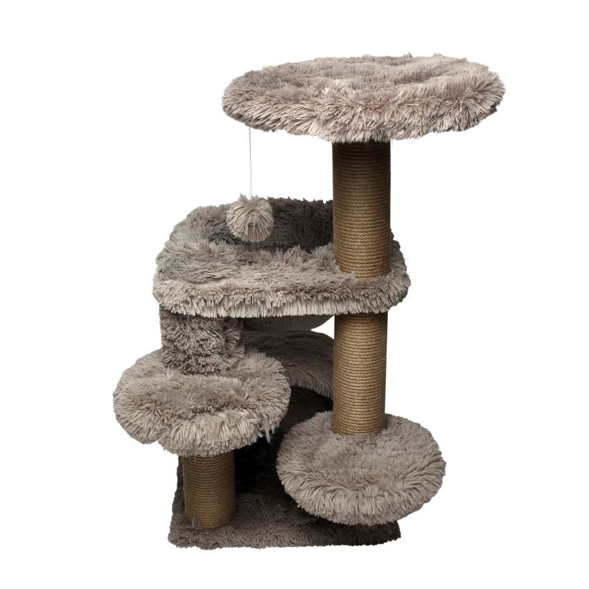 Това котешко дърво съчетава комфорт, функционалност и луксозен вид, благодарение на дългокосместото си покритие. Предназначено е да осигури на котката място за почивка, игра и поддръжка на ноктите.