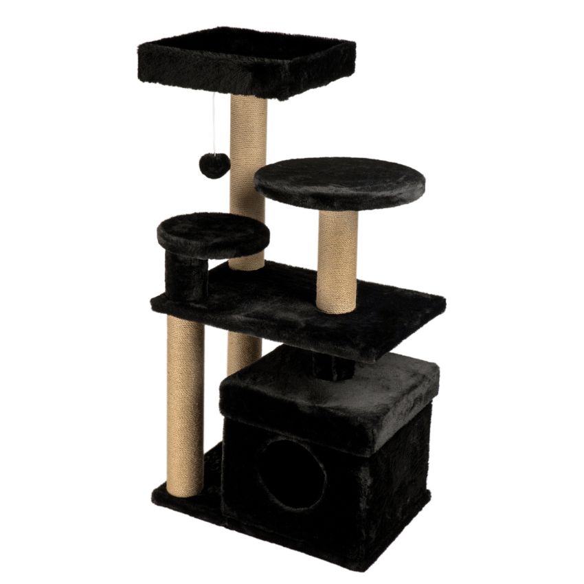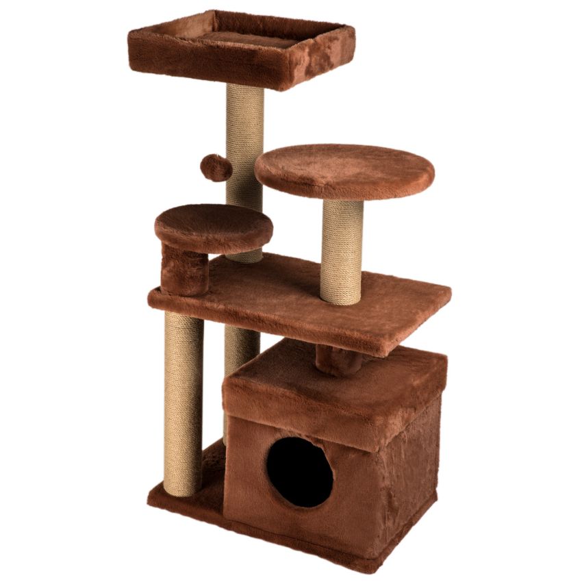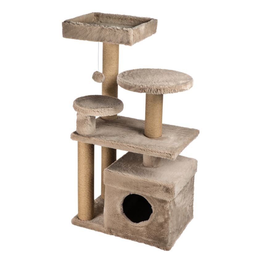 DUBEX Scratching tree е компактно котешко дърво с къщичка, легло и топче за игра, проектирано да осигури на котката уют, забавление и място за грижа за ноктите. Конструкцията е стабилна и функционална, с мека плюшена облицовка и колони, обвити в сизал. Моделът се предлага в три елегантни цвята – бежов, кафяв и черен, които лесно се вписват във всеки интериор.
