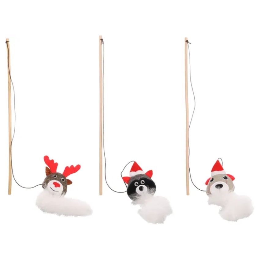 Въдицата е изработен от дърво, а играчката е с добавена котешка трева и пера за гарантирани игри.