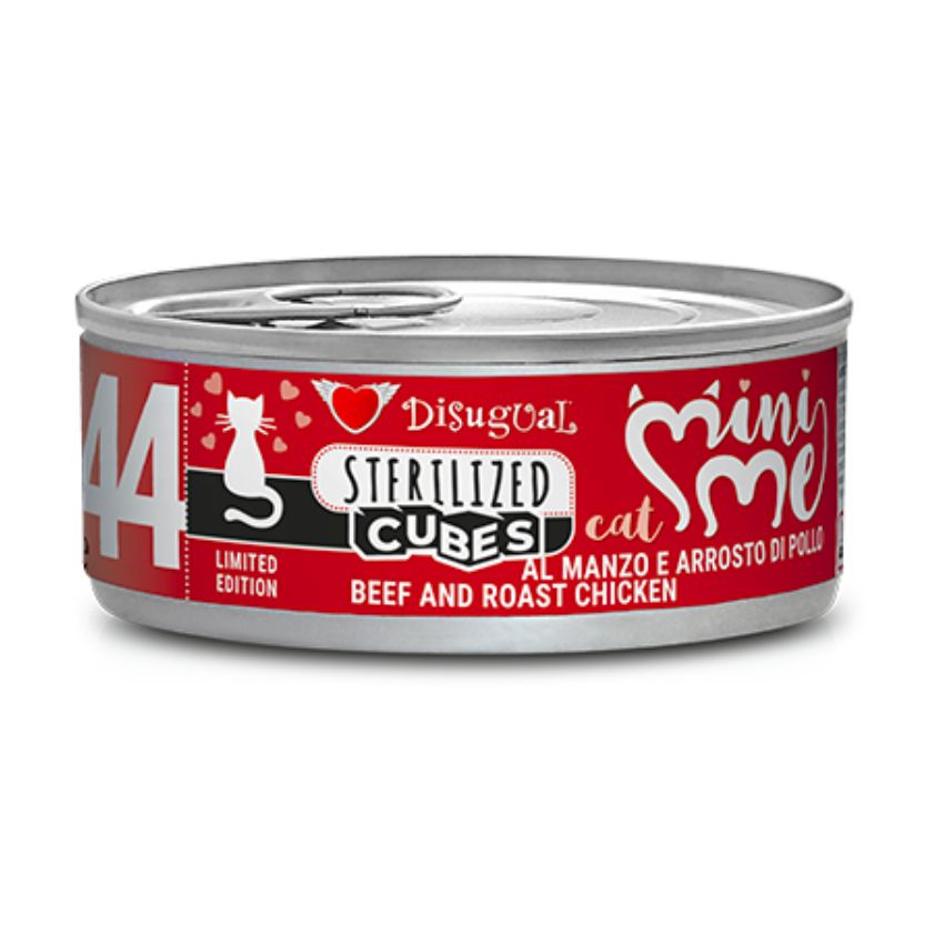 Disugual MiniMe Cubes е пълноценна мокра храна с иновативна текстура – комбинация от смляно месо и апетитни кубчета. Рецептата „Телешко и печено пилешко“ е специално разработена за нуждите на кастрирани котки, като осигурява балансирано хранене, богато на животински протеин, с контролирано съдържание на мазнини и добавени витамини и минерали. Храната е произведена в Италия, без изкуствени консерванти, оцветители и ароматизанти.