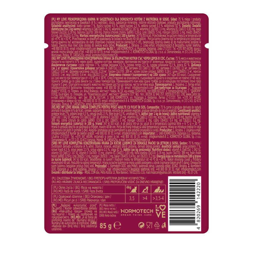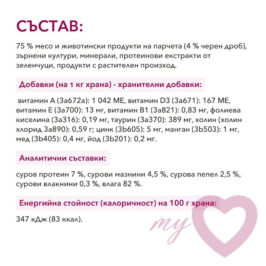 My Love предлага балансирана и вкусна рецепта с висок процент месни съставки – 71% месо и месни субпродукти, включително 6% черен дроб, който е естествен източник на желязо и витамини от група B. Храната е обогатена с жизненоважни витамини, минерали и аминокиселини, които подпомагат здравето, жизнеността и добрия външен вид на вашата котка.