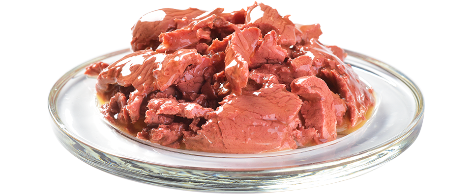 74% месо ,растителни протеинови екстракти, производни от растителен произход (0,4% инулин), минерали, различни захари.