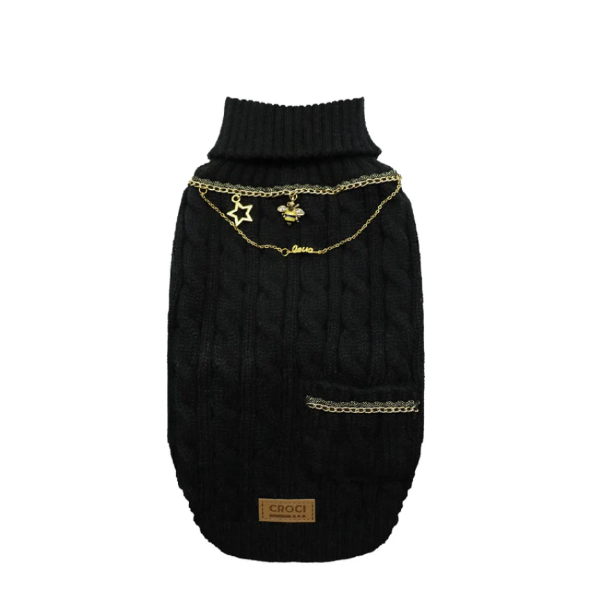 Стилен и изискан пуловер с класическа плетка, украсен със златисти акценти и нежни верижки. Идеален за добавяне на блясък и елегантност към вашата визия, както за ежедневието, така и за специални поводи.