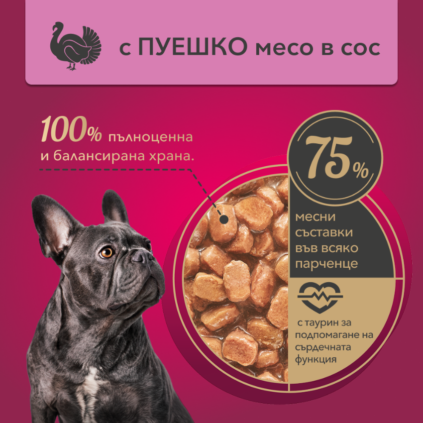 Пълноценна консервирана храна, специално формулирана за възрастни кучета, съдържаща пуешко месо. Осигуря...