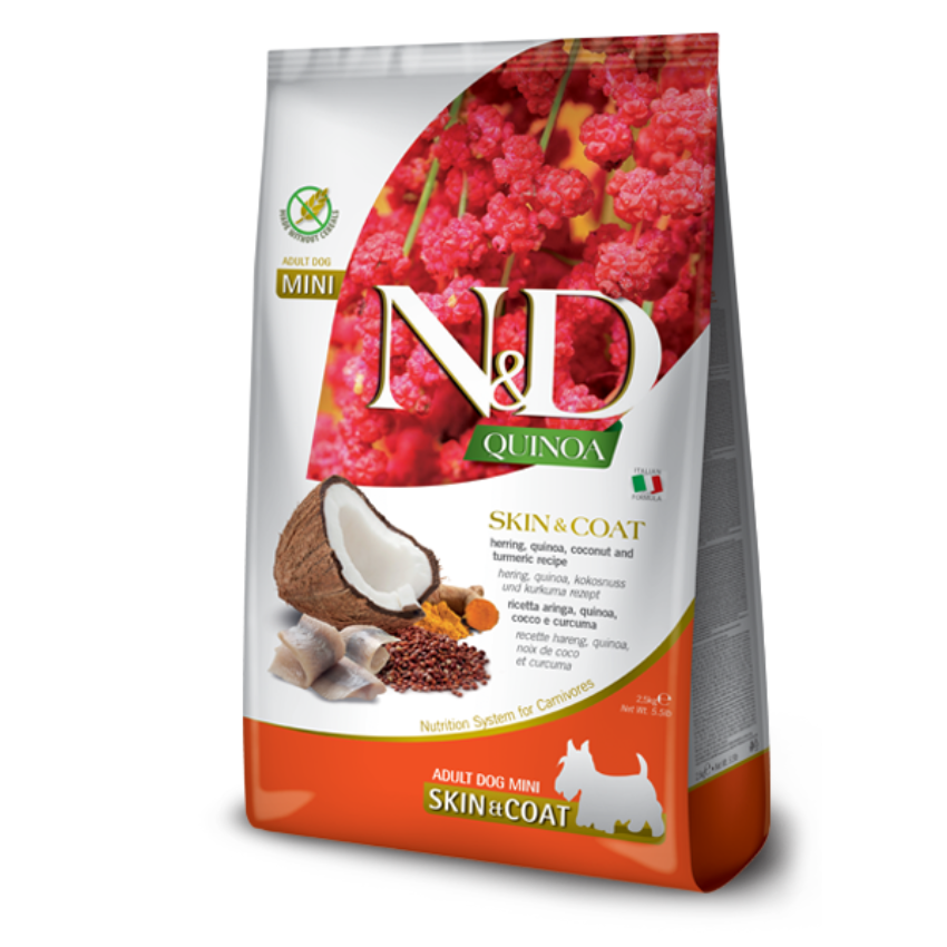 При хранителни чувствителности, полезна за възстановяване и поддържане на здравето на кожата и козината. С ценни хранителни съставки: Кокос: Богат на цинк, важен елемент за защита на кожата; мед, желязо, калий, магнезий, фосфор и натрий. Високото им съдържание на витамини В и С облекчава стреса и се бори с умората. Куркума: Има важен ефект за възстановяването на кожата и е богата на антиоксиданти. Киноа: Подпомага храносмилането, абсорбцията на хранителните вещества и здравето на стомашно-чревния тракт. Източник е на балансирани, ценни аминокиселини, минерали и естествени антиоксиданти. Има нисък гликимичен индекс и не съдържа глутен. Много по-богата е на хранителни вещества от зърнените храни. Помага за предпазването от сърдечно-съдови проблеми.
