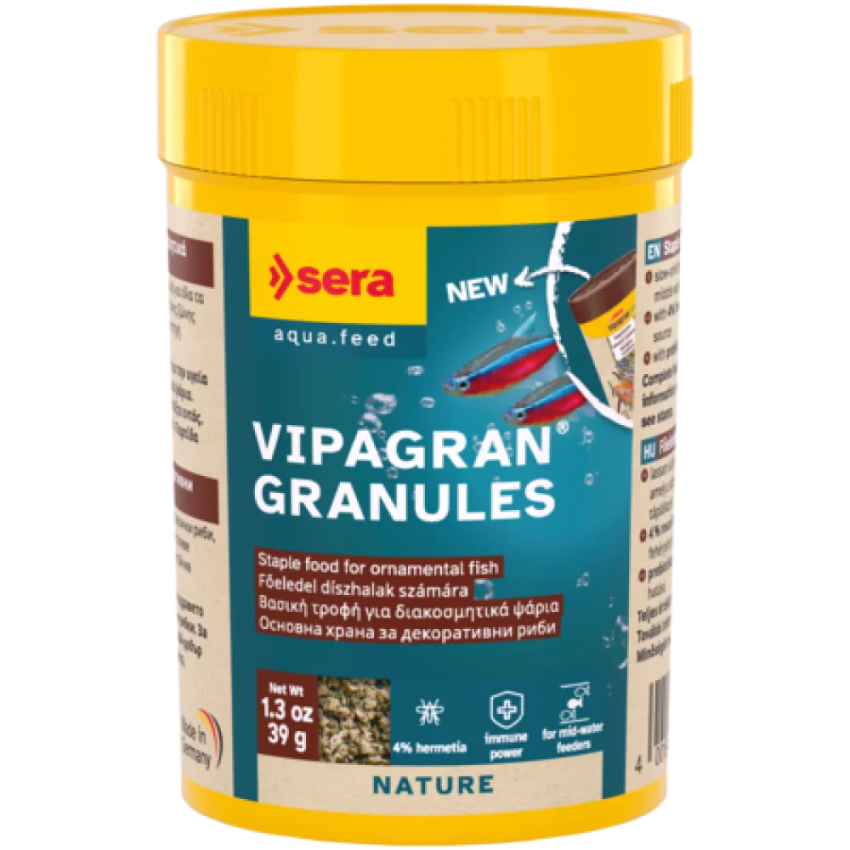Sera Vipagran е висококачествена храна на гранули, подходяща за риби от средните водни слоеве (тетри, дребни цихлиди, брабус и др), която съдържа витамин С и важни микроелементи.